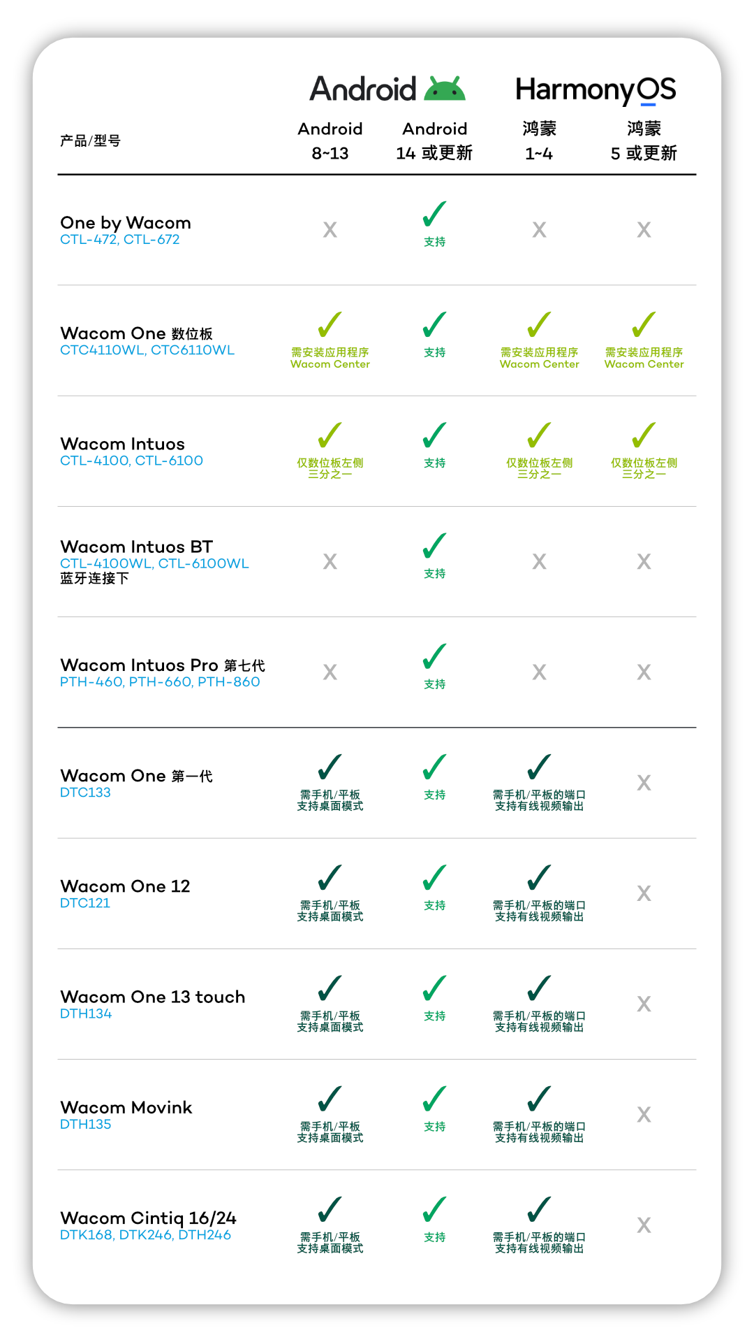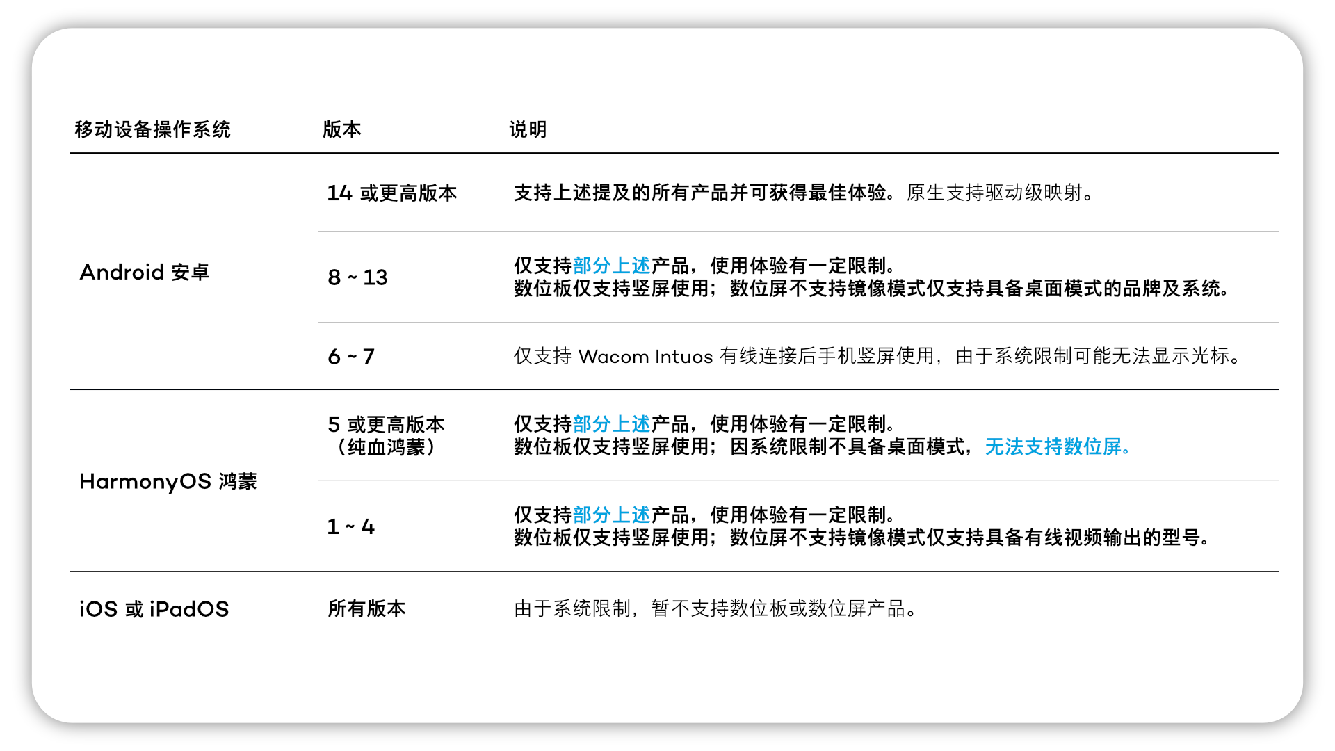 以下是当前支持 Android / 鸿蒙设备的 Wacom 数位板/数位屏可支持的系统版本概述。
