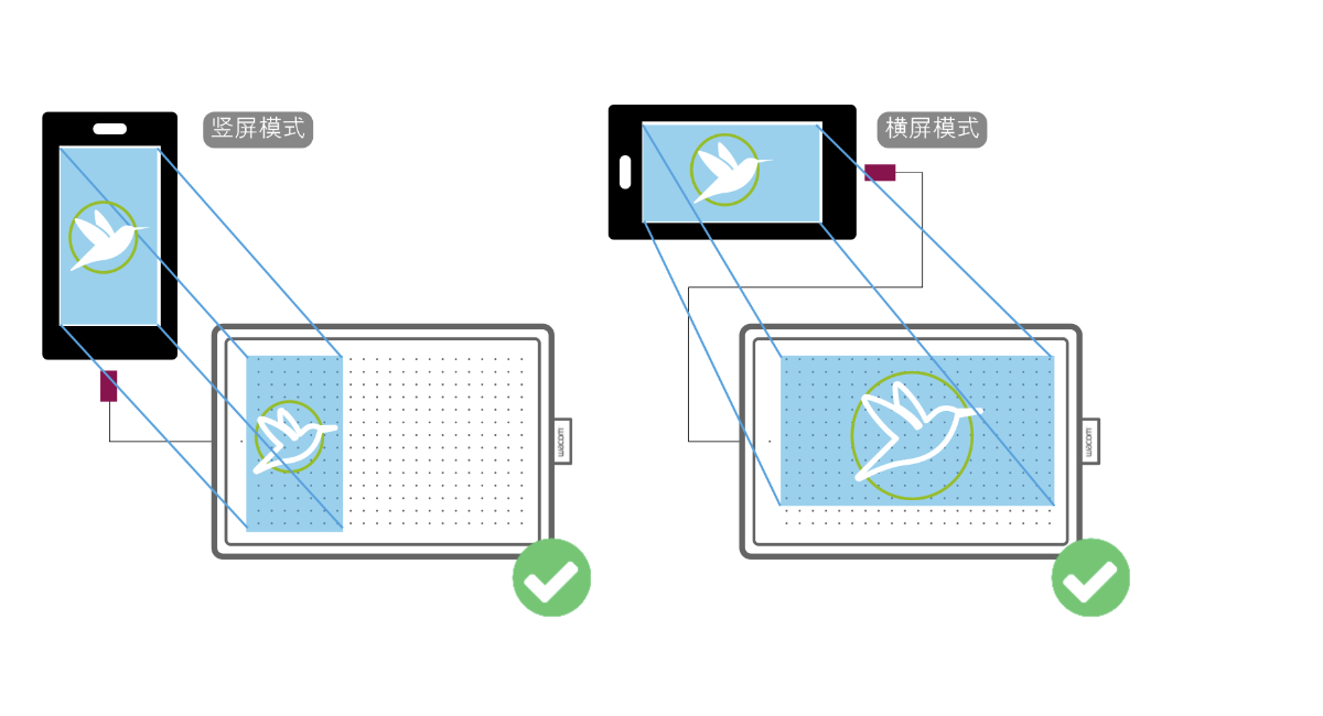 部分手机/平板厂商在竖屏使用时,数位板需顺时针或逆时针旋转 90°,但感应区域依然与手机/平板屏幕一致。