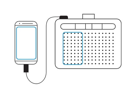 Wacom Intuos 具备两种模式——PC 模式及 OTG 模式。PC 模式便是传统的数位板用于电脑端的模式,全感应区域可用。OTG 模式是专为当时的 Android 环境所开发,通过有线连接,自动识别手机/平板电脑后进入 OTG 模式。而针对手机/平板的竖屏使用及早期系统限制,通过裁切感应区域至左侧 1/3 的面积,使感应区域的长宽比近似手机/平板的竖屏状态,从而达到最低程度变形失真的作画体验。