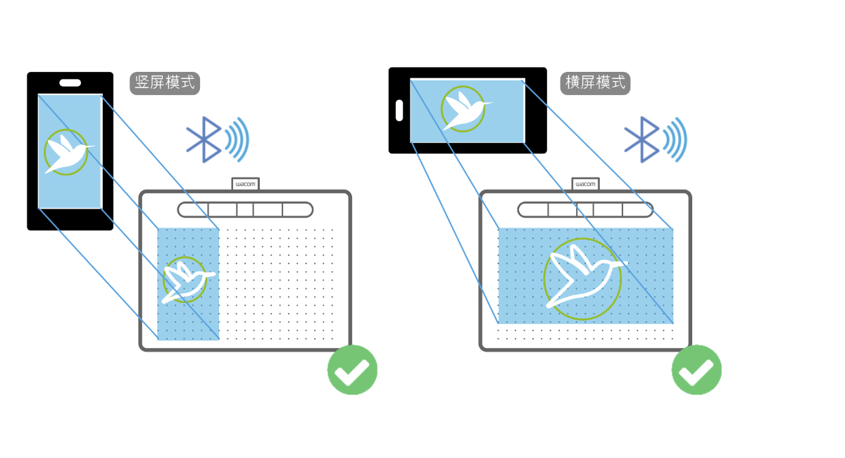 部分手机/平白厂商在竖屏使用时,数位板需顺时针或逆时针旋转 90°,但感应区域依然与手机/平板屏幕一致。