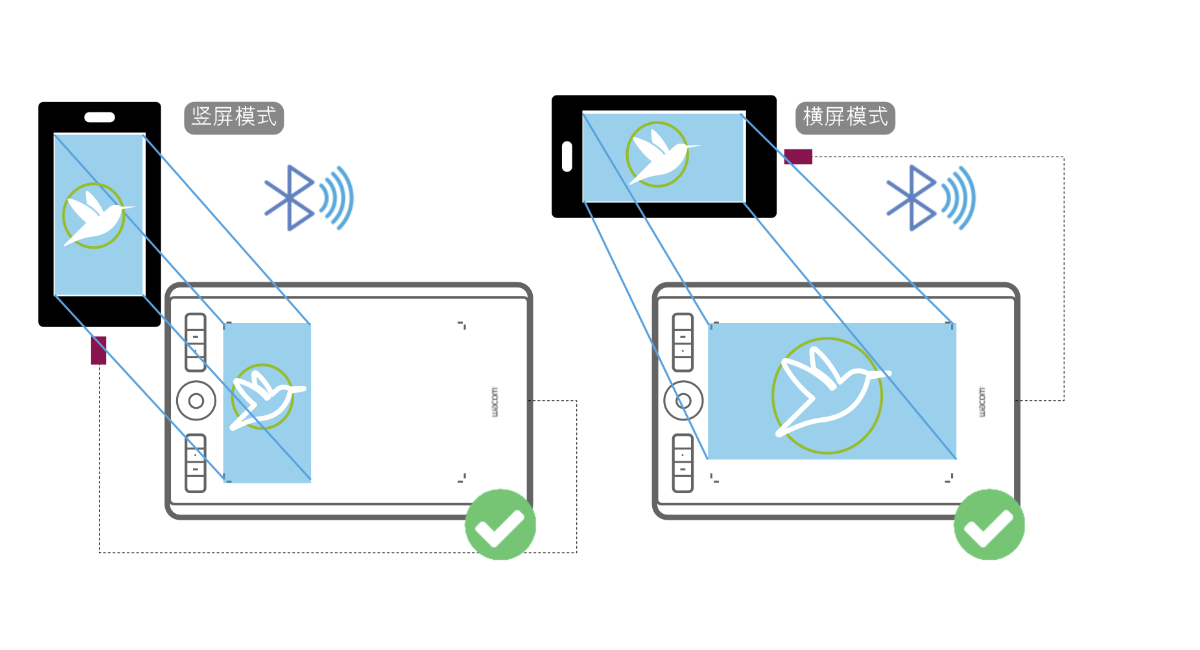 正常情况下数位板无论手机/平板横屏或竖屏,感应区域长宽比均和手机/平板屏幕的长宽比完全一致,原生比例的映射,感应区域位置紧靠数位板的左侧及顶部。