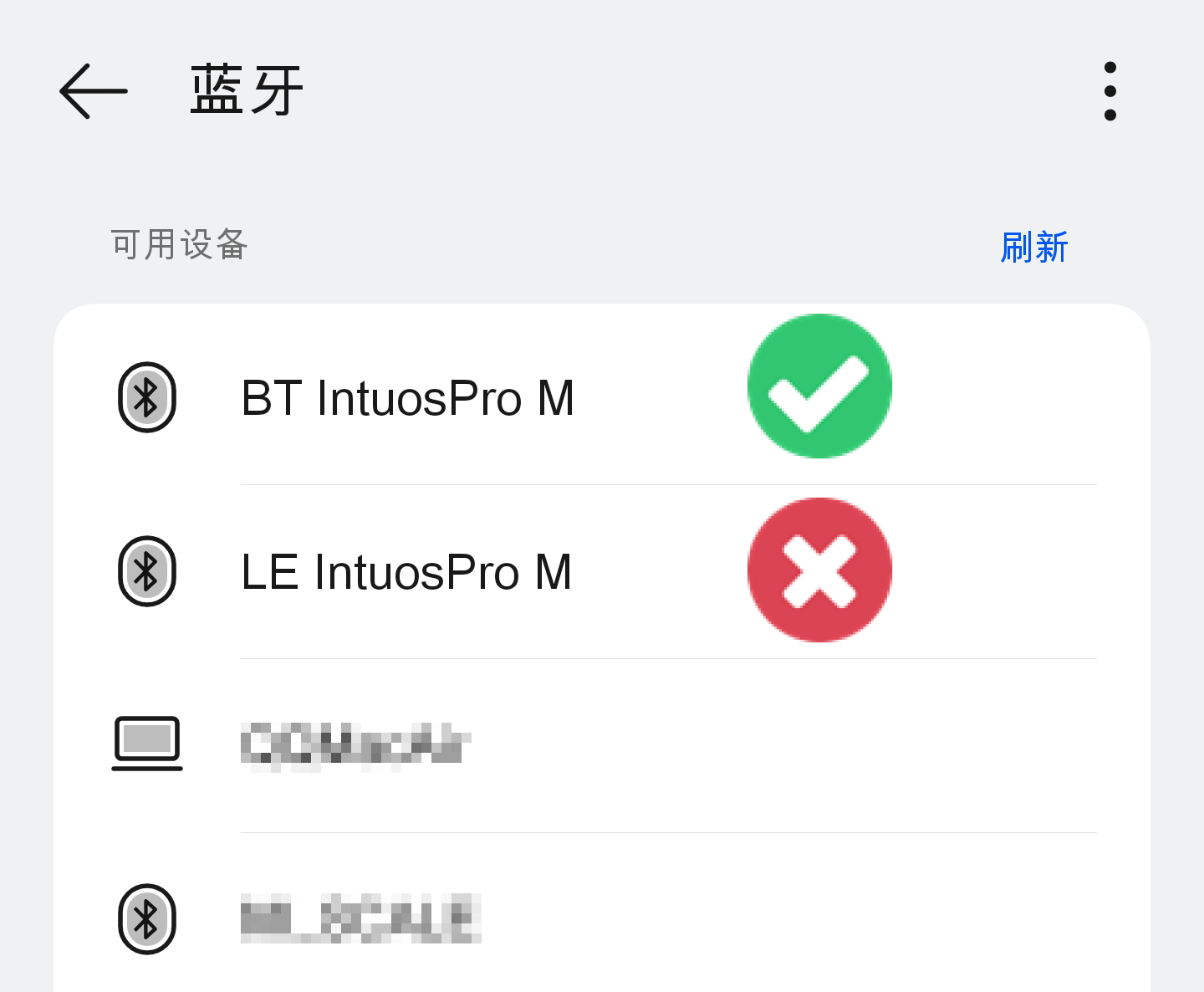 M 号(PTH-660)及 L 号(PTH-860):长按触控环中间的按键,另一侧的 LED 状态指示灯为蓝色闪烁状态,点击手机/平板的蓝牙添加新设备 Intuos Pro BT。请仅选择带「BT」字样的识别设备,而非「LE」字样的设备。