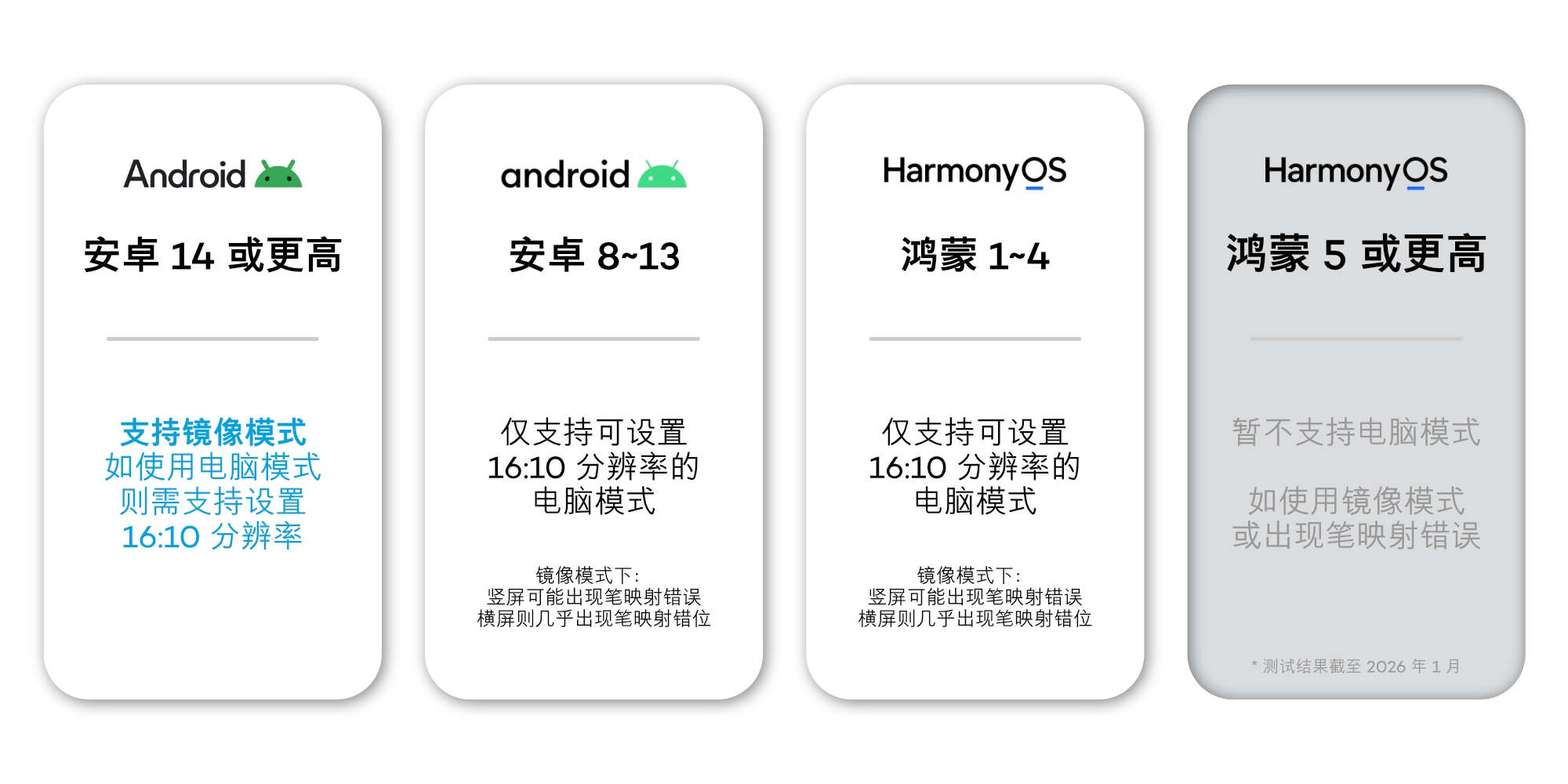 针对 Android 8~13 以及鸿蒙系统下的系统限制,Wacom Cintiq 16 则需手机/平板系统除了支持有线视频传输能力之外,还需内置的电脑模式/桌面模式并且支持 16:10 的分辨率(如 1920 x 1200、2560 x 1600),如三星 DeX、摩托罗拉 ready for 模式等。通过桌面模式,即便不使用 Android 14 或更高版本,也能在外接的 16:10 的这个电脑模式下轻松使用数位屏。